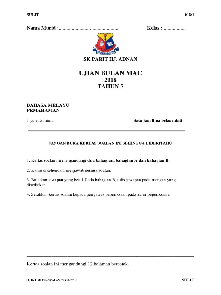 Ianya dianggap ujian kedua terpenting selepas Peperiksaan Akhir Tahun kerana bakal menguji separuh dari semua topik atau bab pembelajaran bagi tahun ini. Sediakan Ruang Belajar Yang Sesuai Pastikan anda mempunyai ruang yang cukup untuk meletakkan segala bahan dan nota anda. Soalan ujian pertengahan tahun bahasa melayu t.